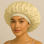 Sa conception large s’associe à un élastique souple, pensé pour assurer un maintien confortable et stable sans marquer la peau. Le bonnet reste bien en place tout au long de la nuit, tout en laissant aux cheveux l’espace nécessaire pour conserver leur forme et leur volume. Une solution idéale pour celles et ceux qui recherchent un bonnet de nuit en soie capable d’accueillir une chevelure dense sans compromis sur le confort.