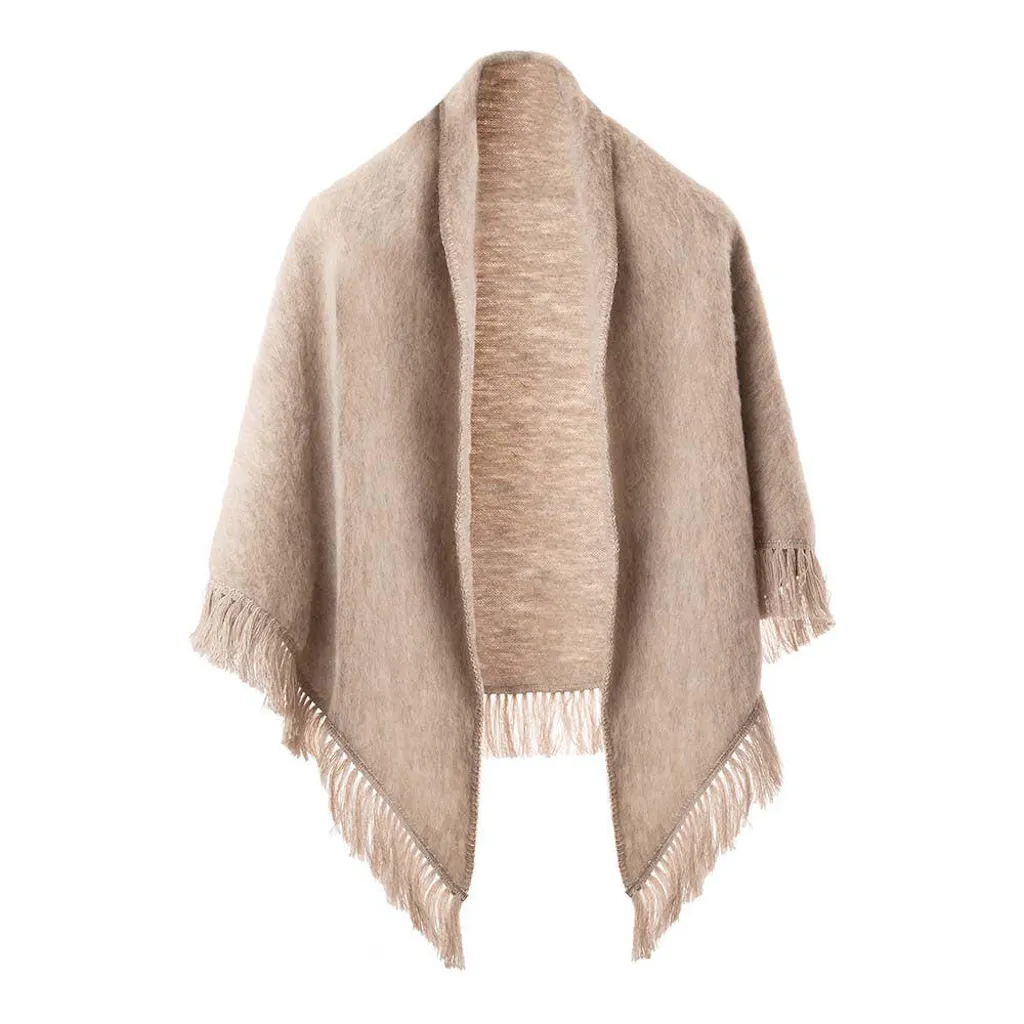 Vous pouvez aussi transformer votre grand châle en une cape élégante en le disposant sur vos épaules et en le sécurisant avec une broche. Les franges ajoutent une note décontractée à cette option chic, parfaite pour les soirées d'hiver.