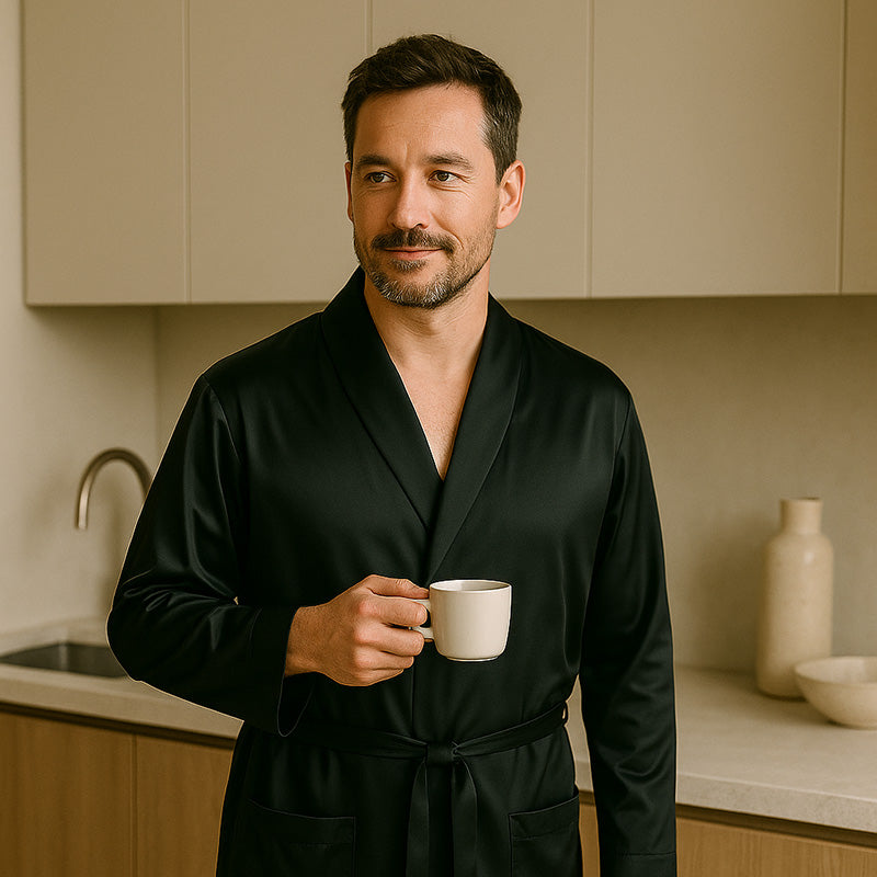 Plongez dans un univers de raffinement avec notre peignoir long en soie pour homme, transformant chaque moment de votre journée en expérience luxueuse. Sa texture soyeuse vous accompagne du réveil à la soirée, tandis que ses deux poches fonctionnelles et sa ceinture assortie allient élégance et praticité. Au contact direct de votre peau, ce vêtement d'exception révèle sa véritable essence : un confort absolu, une élégance discrète et une sensation de bien-être incomparable que vous ne voudrez plus quitter.