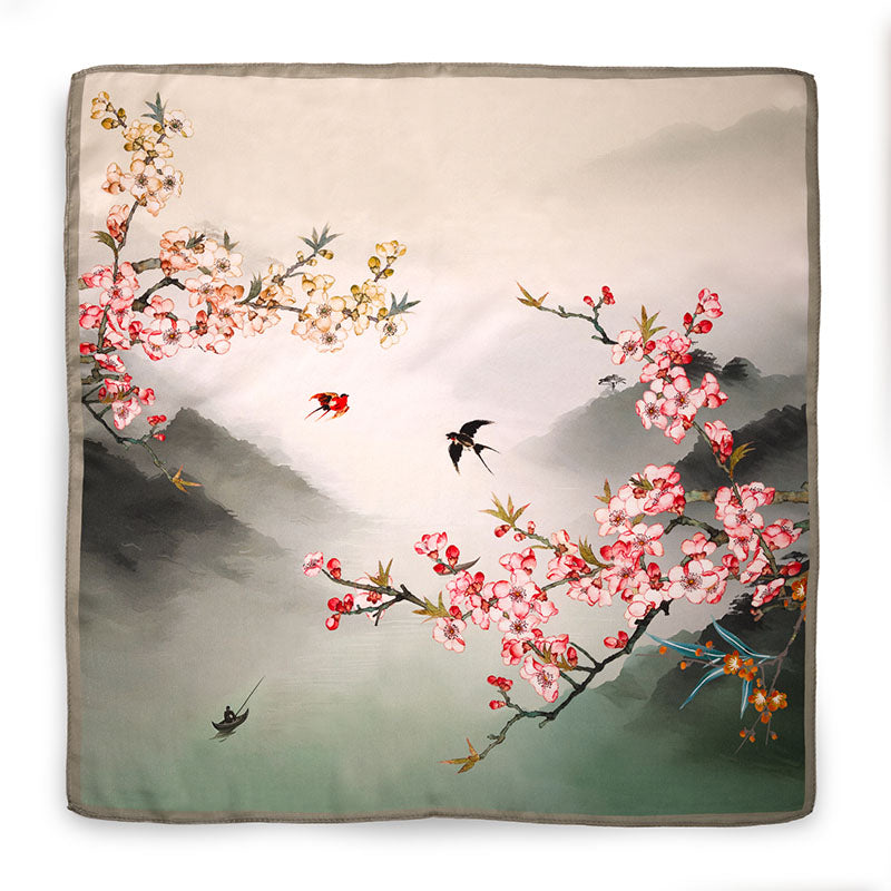Le dessin évoque un paysage paisible, inspiré des scènes traditionnelles japonaises. Les nuances végétales de vert tendre et de gris diffus créent une atmosphère douce, ponctuée par la floraison délicate des cerisiers. Quelques oiseaux traversent l’espace, tandis qu’une silhouette discrète glisse sur l’eau, presque fondue dans le décor.