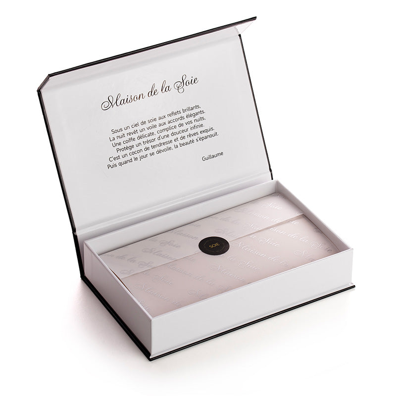 Livré dans un luxueux coffret, notre turban en soie est l’accessoire indispensable pour un sommeil de beauté.